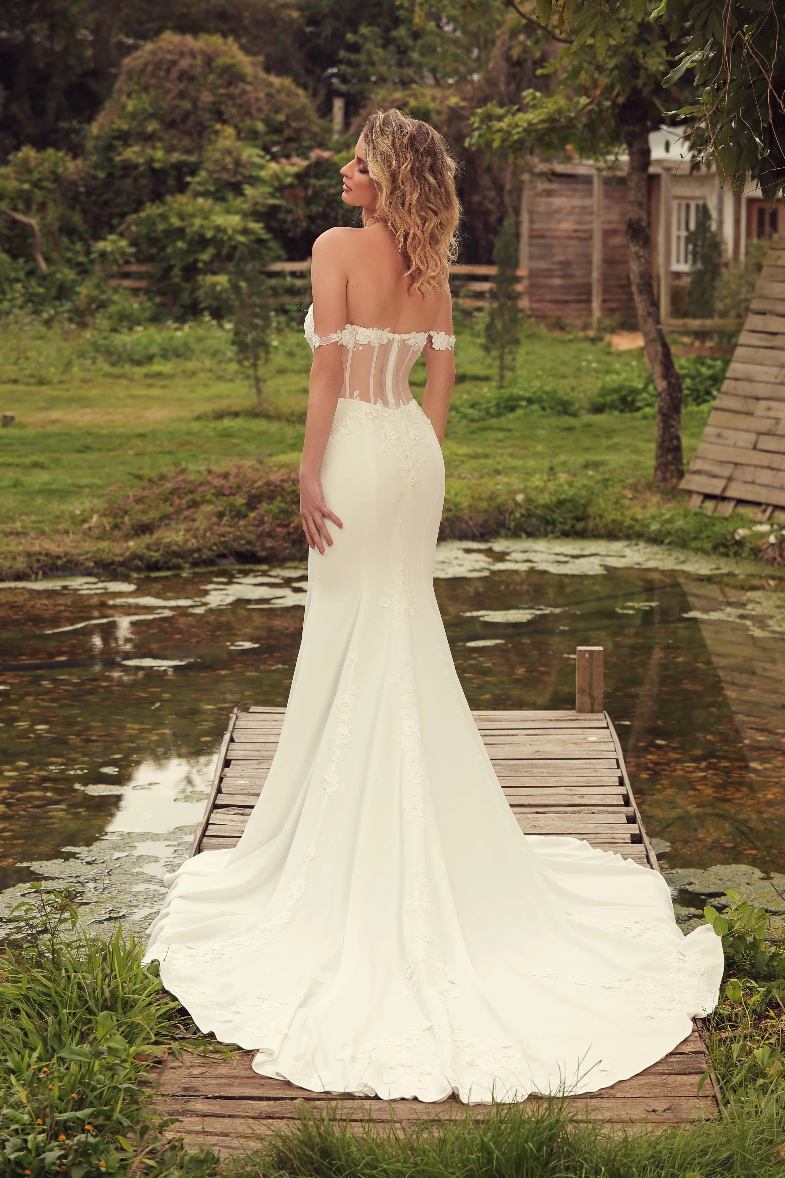 A representative of clean minimalism, Esme is crafted on flowy soft crepe top to toe. The meticulously beaded lace flowers decorate the sweetheart bodice, an illusion boned back and a pair of detachable off-shoulder straps. Lace flowers are arranged all over to the mermaid skirt with a romantic charming train.